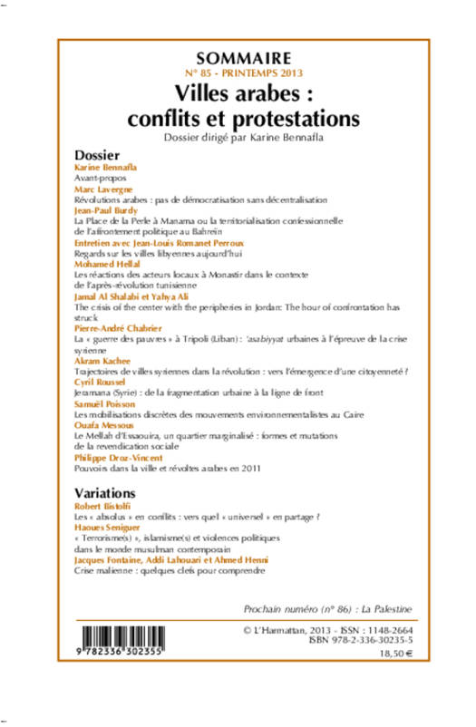L'un des partis-pris de ce numéro est d'évoquer en priorité la situation et le sort des villes moyennes ou périphériques du monde arabe. Au sommaire, entre autres : La Place de la Perle à Manama (Barhein); Les réactions des acteurs locaux à Monastir dans le contexte de l'après-révolution tunisienne ; La "guerre des pauvres" à Tripoli ; Jeramana (Syrie) : de la fragmentation urbaine à la ligne de front ; Mobilisations discrètes des mouvements environnementalistes au Caire ; Le Mellah d'Essaouira...
