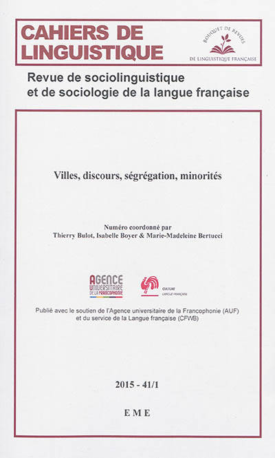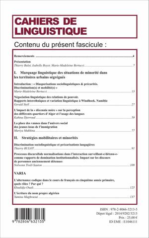 Au sommaire : Marquage linguistique des situations de minorité dans les territoires ségrégués (M.-M. Bertucci) / Négociation linguistique des relations de pouvoir. Rapports interethniques et variation linguistique à Windhoek, Namibie (G. Stell) / L'impact de la "décennie noire" sur la perception des différents quartiers d'Alger et l'usage des langues (K. Djerroud) / La place des vannes dans l'univers social des jeunes issus de l'immigration (M. Mukhina) / Stratégies mobilitaires et minorités (T. Bulot) / Processus discursif de normalisations dans l'interaction surveillant-e/détenu-e comme rapports de domination institutionnalisés. (N. Troël-Sauton).