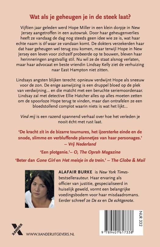 In Vind mij van New York Times-bestsellerauteur Alafair Burke is het vijftien jaar geleden dat Hope Miller in een klein dorpje in New Jersey werd aangetroffen in een autowrak. Door haar geheugenverlies heeft ze vandaag de dag nog steeds geen idee wie ze is, wat haar echte naam is óf waar ze vandaan komt. De dokters verzekerden haar dat haar geheugen wel terug zou komen, maar terwijl Hope in New Jersey een leven voor zichzelf probeerde op te bouwen, bleven haar herinneringen angstvallig stil. Nu wil ze de staat alsnog verlaten, maar haar advocaat en beste vriendin Lindsay Kelly ziet de verhuizing naar East Hampton niet zitten.