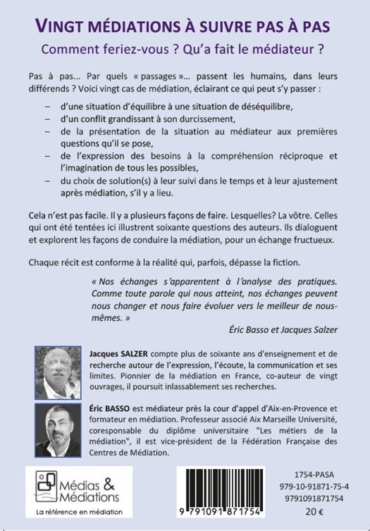 Ces vingt récits apportent de nombreuses questions que les médiateurs en formation, débutants ou confirmés, peuvent se poser. Comment feriez-vous ? Qu'a fait le médiateur ? À la suite de chaque récit, les auteurs ont échangé leurs réponses, analysé la situation, imaginé d’autres façons de conduire la médiation, pour un échange fructueux. Chaque récit est conforme à la réalité qui, parfois dépasse la fiction. « Nos échanges s’apparentent à l’analyse des pratiques. [...] Ce livre est un livre de dialogue. Comme toute parole qui nous atteint, nos échanges peuvent nous changer et nous faire évoluer vers le meilleur de nous-mêmes.»