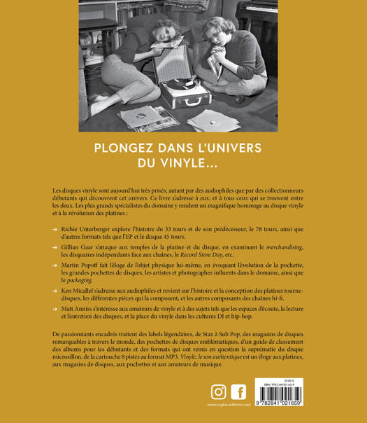 Les disques vinyle sont aujourd’hui très prisés, autant par des audiophiles que par des collectionneurs débutants qui découvrent cet univers. Ce livre s’adresse à eux, et à tous ceux qui se trouvent entre les deux. Les plus grands spécialistes du domaine y rendent un magnifique hommage au disque vinyle et à la révolution des platines : - Richie Unterberger explore l’histoire du 33 tours et de son prédécesseur, le 78 tours, ainsi que d’autres formats tels que l’EP et le disque 45 tours. - Gillian Gaar s’attaque aux temples de la platine et du disque, en examinant le merchandising, les disquaires indépendants face aux chaînes, le Record Store Day, etc. - Martin Popoff fait l’éloge de l’objet physique lui-même, en évoquant l’évolution de la pochette, les grandes pochettes de disques, les artistes et photographes influents dans le domaine, ainsi que le packaging. - Ken Micallef s’adresse aux audiophiles et revient sur l’histoire et la conception des platines tournedisques, les différentes pièces qui la composent, et les autres composants des chaînes hi-fi. - Matt Anniss s’intéresse aux amateurs de vinyle et à des sujets tels que les espaces d’écoute, la lecture et l’entretien des disques, et la place du vinyle dans les cultures DJ et hip-hop.