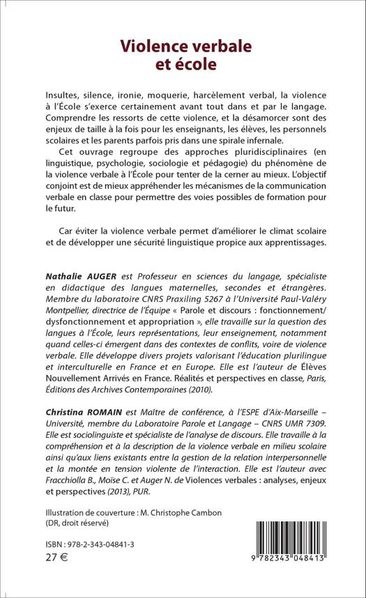 Insultes, silence, ironie, moquerie, harcèlement verbal, la violence à l'École s'exerce certainement avant tout dans et par le langage. Cet ouvrage regroupe des approches pluridisciplinaires (en linguistique, psychologie, sociologie et pédagogie) du phénomène de la violence verbale à l'École. Eviter la violence verbale permet d'améliorer le climat scolaire et de développer une sécurité linguistique propice aux apprentissages.