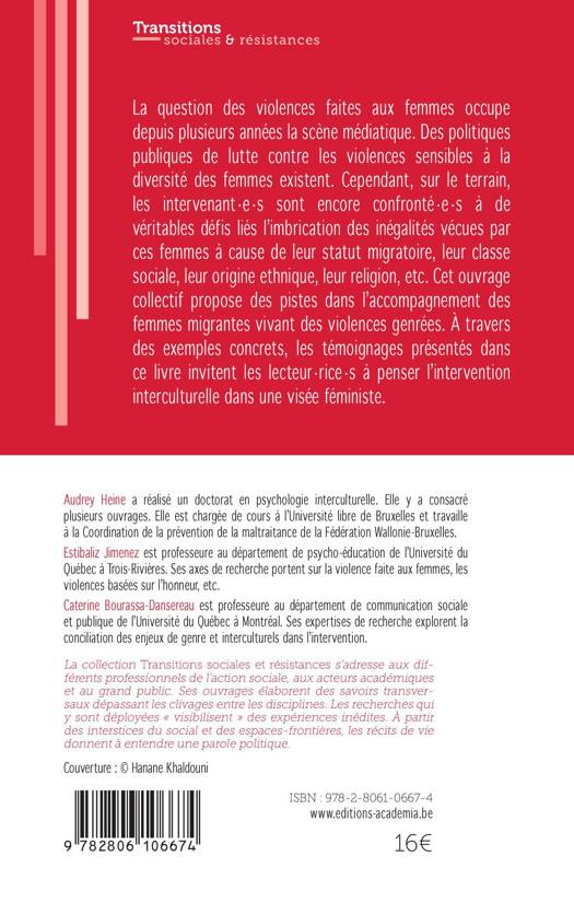 Les professionnel·le·s accompagnant les femmes migrantes victimes de violences sont confronté·e·s à d'importants défis liés à la multiplicité des discriminations vécues par ces femmes. Dans cet ouvrage, des intervenant·e·s proposent des pistes pour intégrer les enjeux interculturels et liés au genre, dans les pratiques professionnelles. À travers des exemples concrets, les témoignages invitent les lecteurs et lectrices à penser l'intervention interculturelle dans une visée féministe.