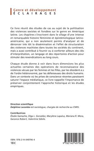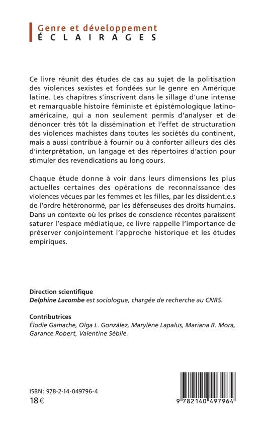 Ce livre réunit des études de cas au sujet de la politisation des violences sexistes et fondées sur le genre en Amérique latine. Les chapitres s'inscrivent dans le sillage d'une intense et remarquable histoire féministe et épistémologique latinoaméricaine, qui a non seulement permis d'analyser et de dénoncer très tôt la dissémination et l'effet de structuration des violences machistes dans toutes les sociétés du continent, mais a aussi contribué à fournir ou à conforter ailleurs des clés d'interprétation, un langage et des répertoires d'action pour stimuler des revendications au long cours. Chaque étude donne à voir dans leurs dimensions les plus actuelles certaines des opérations de reconnaissance des violences vécues par les femmes et les filles, par les dissident.e.s de l'ordre hétéronormé, par les défenseuses des droits humains. Dans un contexte où les prises de conscience récentes paraissent saturer l'espace médiatique, ce livre rappelle l'importance de préserver conjointement l'approche historique et les études empiriques.