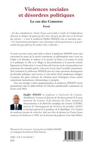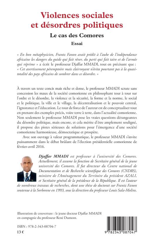 À travers un texte concis mais riche et dense, le professeur MMADI scrute sans concession les maux de la société comorienne en philosophant tour à tour sur l'ordre et le désordre, la violence et la sécurité, la forme et la norme, le social et le politique, la ville et le village, la décentralisation et le pouvoir central, l'ignorance et l'éducation. Cet ouvrage à valeur programmatique s'invite dans le débat brûlant de l'élection présidentielle comorienne de 2016.