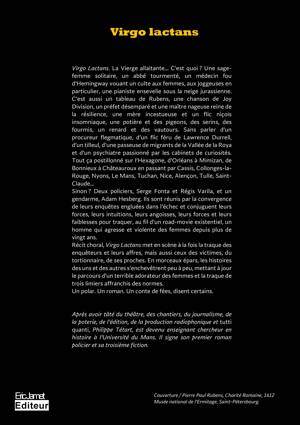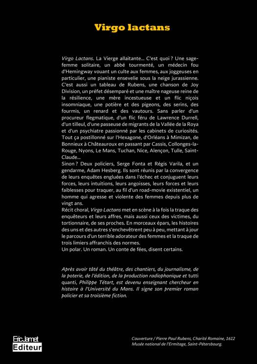 Virgo lactans. La Vierge allaitante... C’est quoi ? Une sage-femme solitaire, un abbé tourmenté, un médecin fou d’Hemingway vouant un culte aux femmes, aux joggeuses en particulier, une pianiste ensevelie sous la neige jurassienne. C’est aussi un tableau de Rubens, une chanson de Joy Division, un préfet désemparé et une maître nageuse reine de la résilience, une mère incestueuse et un flic niçois insomniaque, une potière et des pigeons, des serins, des fourmis, un renard et des vautours. Sans parler d’un procureur flegmatique, d’un flic féru de Lawrence Durrell, d’un tilleul, d’une passeuse de migrants de la Vallée de la Roya et d’un psychiatre passionné par les cabinets de curiosités. Tout ça postillonné sur l’Hexagone, d’Orléans à Mimizan, de Bonnieux à Châteauroux en passant par Cassis, Collonges-la-Rouge, Nyons, Le Mans, Tuchan, Nice, Alençon, Tulle, Saint-Claude...