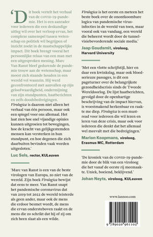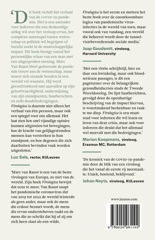 'Dit boek vertelt het verhaal van de covid-19-pandemie. Het is een aanrader voor iedereen die een deskundige uitleg wil over het verloop ervan, het complexe samenspel tussen wetenschap en politiek wil begrijpen of inzicht zoekt in de maatschappelijke impact. Dit boek brengt vooral het persoonlijke relaas van een man met een uitgesproken mening. Marc Van Ranst bleef gedurende de pandemie trouw aan de wetenschap, maar moest zich staande houden in een wereld vol waanzin. Hij werd geconfronteerd met aanvallen op zijn geloofwaardigheid, ondermijning van zijn standpunten, haatberichten en zelfs doodsbedreigingen. Virologica is daarom niet alleen het verhaal van één persoon, maar ook een spiegel voor ons allemaal. Het laat zien hoe snel vijandige opinies kunnen uitgroeien tot bewegingen, hoe de kracht van gelijkgestemden mensen kan versterken in hun standpunt, en hoe degenen die zich daarbuiten bevinden vaak worden uitgesloten.' - Luc Sels, rector, KULeuven