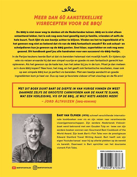 In de Parijse keukens leerde Bart al dat vis bereiden helemaal niet moeilijk hoeft te zijn. En tijdens zijn vele vis-reizen ervaarde hij dat een simpel vuurtje en goede vis een fantastisch gerecht kan opleveren. Als het gewoon op de kade kan, kan het zeker bij jou in de tuin. Moet je dan meteen zo'n dure BBQ kopen? Nee hoor, het mag, en het geeft ook fantastische resultaten, maar ook op een simpele BBQ kun je perfect vis bereiden. Met een beetje aandacht en goede ingrediënten kom je heel ver. Dus op naar je favoriete visboer of het visschap en de fik erin!