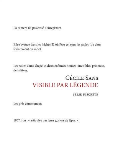 "Depuis Le Geste d’après, la caméra n’a pas cessé d’enregistrer.Elle s’avance dans les friches, là où l’eau est sous les sables (ou dans l’éclatement du récit).Les restes d’une chapelle, deux enfances nouées : invisibles, présentes, définitives.Les prés communaux.1857. [ou : « articulée par leurs gosiers de lèpre. »]Enfance n’est pas un mot, ni un temps, ni des images. Enfance est un vide, un creusement et, surtout, la chance possible d’une grenade à incendie (d’une puissance de déflagration).Légende est une formule chimique, un révélateur photographique, elle troue le papier, elle attaque à l’acide et en silence.Car le silence, plus que jamais, fait partie de la partition.Mais le film reprend et confirme (insiste) : oui, ainsi, »Cécile Sans