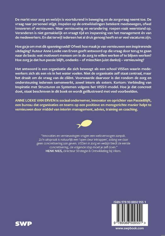 Het antwoord is een organisatie die zich beweegt als een school VISSen waarin medewerkers zich als een vis in het water voelen. Niet de organisatie zelf - de structuren, systemen, regels en procedures - staat centraal, maar het draait om de vraag van de cliënt. Voorwaarde daarvoor is dat rondom de zorg en ondersteuning iedereen samenwerkt, zowel intern als extern. Kortom: Verbinding van Inspiratie met Structuren en Systemen volgens het VISS®-model. Hoe je dat concreet doet, staat beschreven in dit boek en wordt geïllustreerd met vele voorbeelden.
