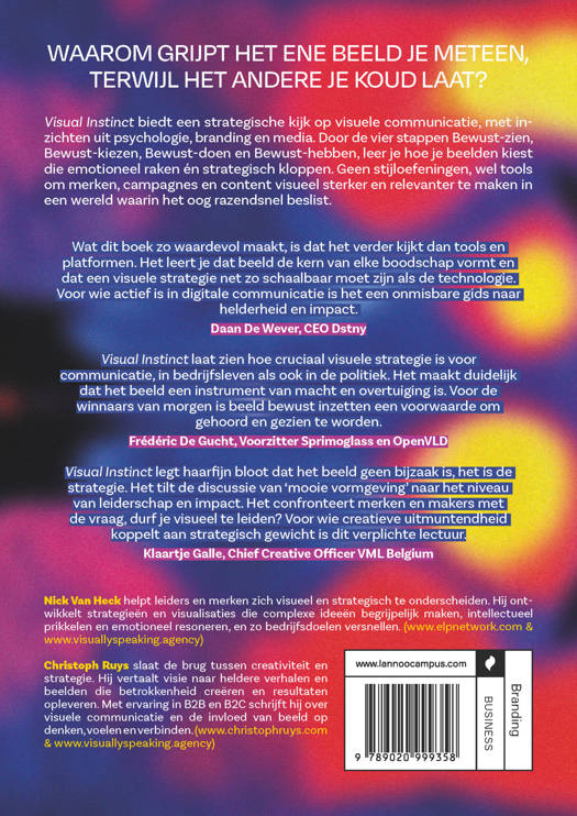 'Wat dit boek zo waardevol maakt, is dat het verder kijkt dan tools en platformen. Het leert je dat beeld de kern van elke boodschap vormt en dat een visuele strategie net zo schaalbaar moet zijn als de technologie. Voor wie actief is in digitale communicatie is het een onmisbare gids naar helderheid en impact.' - Daan De Wever, CEO Dstny 'Visual Instinct laat zien hoe cruciaal visuele strategie is voor communicatie, in bedrijfsleven als ook in de politiek. Het maakt duidelijk dat het beeld een instrument van macht en overtuiging is. Voor de winnaars van morgen is beeld bewust inzetten een voorwaarde om gehoord en gezien te worden.' - Frédéric De Gucht, Voorzitter Sprimoglass en OpenVLD 'Visual Instinct legt haarfijn bloot dat het beeld geen bijzaak is, het ís de strategie. Het tilt de discussie van 'mooie vormgeving' naar het niveau van leiderschap en impact. Het confronteert merken en makers met de vraag, durf je visueel te leiden? Voor wie creatieve uitmuntendheid koppelt aan strategisch gewicht is dit verplichte lectuur.' - Klaartje Galle, Chief Creative Officer VML Belgium