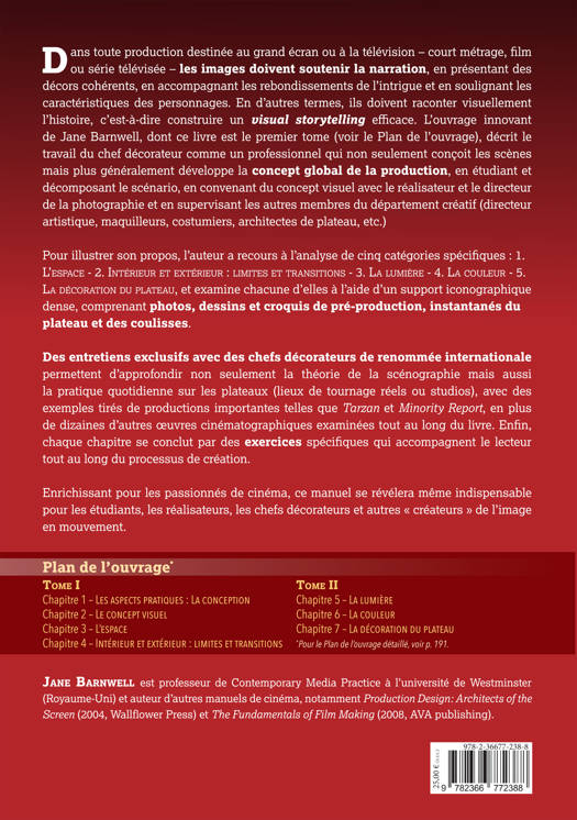 Du point de vue du visual storytelling un film est surtout un récit par images dont les éléments visuels doivent séduire le spectateur. L'ouvrage, qui est divisé en deux volumes, est pensé pour les réalisateurs et les chefs décorateurs, mais aussi pour les décorateurs débutants. Dans cette oeuvre sans précédent, Jane Branwell propose une nouvelle méthode pour mieux utiliser tous les éléments visuels d'un film et raconter une histoire à travers les images en analysant 5 différentes catégories : Espace (Vol. 1), Intérieurs et Extérieurs (Vol. 1), Lumière (Vol. 2), Couleur (Vol. 2), Décor (Vol. 2). Dans ce premier volume seront au préalable développés les aspects pratiques du processus de création et la notion de concept. Chaque chapitre présente aussi un entretien avec un illustre chef décorateur, une riche galerie d'images, les brouillons des décors des films réalisés par la préproduction, les photos du backstage des différents ateliers créatifs ainsi que des exercices pour la mise en pratique.