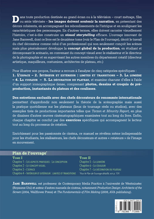 Du point de vue du "visual storytelling" un film est surtout un récit par images dont les éléments visuels doivent séduire le spectateur. L'ouvrage, qui est divisé en deux volumes, est pensé pour les réalisateurs et les chefs décorateurs, mais aussi pour les décorateurs débutants. Dans cette oeuvre sans précédent, Jane Branwell propose une nouvelle méthode pour mieux utiliser tous les éléments visuels d'un film et raconter une histoire à travers les images. Dans le deuxième volume, elle analyse la lumière, la couleur et le décor. Chaque chapitre présente aussi un entretien avec un illustre chef décorateur, une riche galerie d'images, les brouillons des décors des films réalisés par la préproduction, les photos du backstage des différents ateliers créatifs ainsi que des exercices pour la mise en pratique.