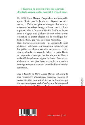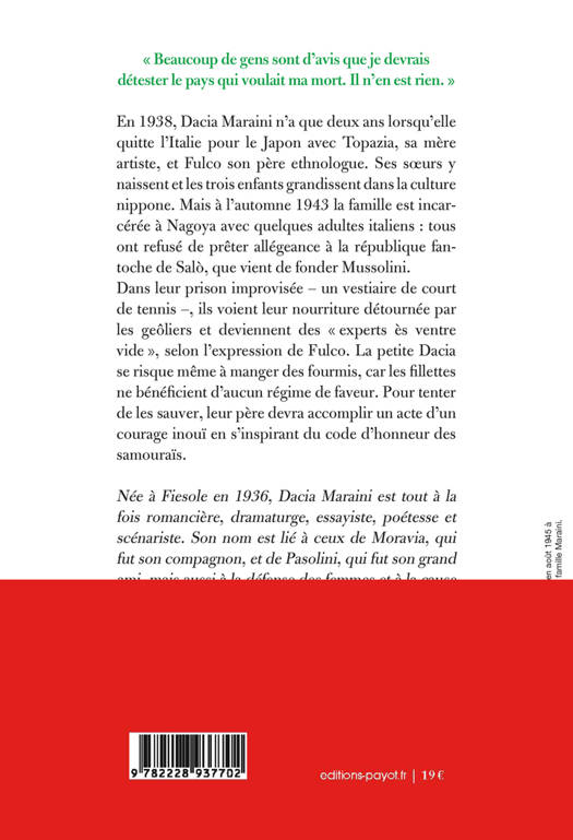 À l'automne 1943, l'ethnologue italien Fulco Maraini et sa famille, installés depuis cinq ans au Japon, sont incarcérés à Nagoya avec quelques compatriotes pour avoir refusé de prêter allégeance à la nouvelle république mussolinienne de Salò. Leurs geôliers détournent la nourriture et les transforment ainsi en «savants de la faim», comme dit Fulco. Jusqu'au jour où il applique le code d'honneur des samouraïs et se tranche un doigt devant un gardien insultant. Il reçoit en retour une chèvre dont le lait sauvera les captifs. Un témoignage poignant sur l'enfance confisquée par la guerre ; une expérience qui est pour beaucoup dans la vocation de l'écrivaine engagée, grande dame des lettres italiennes.