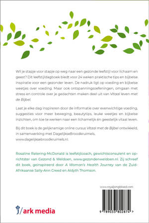Wil je stapje voor stapje op weg naar een gezonde leefstijl voor lichaam en geest? Dit leefstijldagboek biedt voor 24 weken praktische tips en bijbelse inspiratie voor een gezonder leven. De nadruk ligt op voeding en bijbelse weetjes over voeding. Maar ook ontspanningsoefeningen, omgaan met stress en controle over je gedachten maken deel uit van Vitaal leven met de Bijbel.