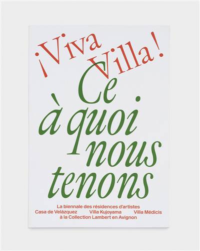 Coédition Dilecta / Collection Lambert / Villa Kujoyama / Villa Médicis / Casa de Velázquez Mise en disponibilité en novembre 2022 Exposition à la Collection Lambert (Avignon) du 12 novembre au 12 février Conçu par la Casa de Velázquez (Madrid), la Villa Kujoyama (Tokyo) et l’Académie de France à Rome – Villa Médicis, le festival ¡ Viva Villa ! est né d’une volonté commune de créer avec le public français un rendez-vous régulier réunissant les artistes accueillis pendant l’année dans ces trois institutions par une exposition, un cycle de films et des spectacles vivants. Le festival conserve sa vocation première depuis sa création en 2016 : offrir au public un état de la jeune création contemporaine, favoriser une transition vers l’après-résidence par des rencontres avec différents acteurs professionnels et construire un réseau amical et artistique. Artistes présentés : Liza Ambrossio, Bianca Argimón, Laía Argüelles, Rudy Ayoun, Iván Castiñeiras, Julien Deprez (accompagné de Claire Vauday), Guillaume Durrieu, Emma Dusong, Francisco Ferro, Silvia Lerín, Clara Marciano, Callisto Mc Nulty, Alessandra Monarcha, Adrian Schindler, Xie Lei ; Carmen Ayala Marín, Najah Albukai, Benjamin Attahir, Chloé Belloc, Maxime Biou, Lise Gaudaire, Julian Lembke, Mathilde Lestiboudois, Anna López Luna, Eve Malherbe, Alberto Martín Menacho, Adrien Menu, Pablo Pérez Palacio, Arnaud Rochard, Mery Sales ; Alice Dusapin, Adila Bennedjaiï-Zou (accompagnée d’Azzedine Saleck et de sa fille Ima Saleck), Noriko Baba, Estefania Peñafiel Loaiza (accompagnée d’Alexis Moreano Band), Coralie Barbe, Clément Périssé et Alice Grégoire, Simon Boudvin (accompagné de Valeria Giuga et de leur fils Dario), Georges Senga, Jacques Julien, Mathilde Denize, Fernando Garnero, Félix Jousserand, Kaouther Adimi, Hèctor Parra, Iván Argote, Charlie Aubry, Theodora Barat, Nidhal Chamekh, Aude Fourel, Marta Gentilucci, Benoît Maire, Samir Boumediene, Noémie Goddard, Evangelia Kranioti, Marielle Macé, Julie Pellegrin, Mathieu Peyroulet Ghilini, Guy Régis Jr. ; Bady Dalloul, Marcus Borja, Alexandre Balgiu, Krikor Kouchian, Anne-Sophie Turion et Éric Minh Cuong Castaing, Céline Pelcé, Flore Falcinelli, Sacha Hourcade et Natacha Poutoux