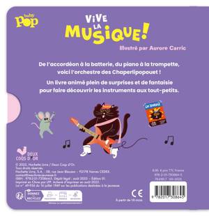 Un tout-carton animé sur la thématique de la musique. 6 animations : tirettes et fenêtres, au fil des pages. Humour et fantaisie. Qui a déjà vu un chat tout rond jouer de l'accordéon ? Un matou noir faire un solo de guitare ? Un gros minet au piano debout sur ses coussinets ? Ou encore un félin qui a du chien se trémousser sur sa batterie ? Si si, la petite souris à la tête du grand orchestre des chaperlipopouet, pardi !