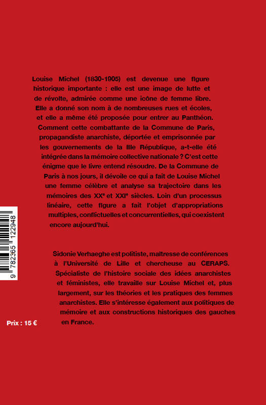 Cet ouvrage permet de comprendre comment Louise Michel est aujourd'hui devenue une référence politique importante. Cette question permet d'interroger les mécanismes de la représentation politique, les spécificités d'une célébrité dont dispose un acteur qui n'est pas dominant, et les modalités de légitimation politique en dehors du système électoral. Comment expliquer qu'une personnalité de femme anarchiste, déportée et emprisonnée par le pouvoir politique de la Troisième République, soit devenue une figure légitime de l'histoire républicaine ? L'ouvrage montre que la postérité de Louise Michel se construit autour de deux paradigmes mémoriels: une mémoire révolutionnaire qui prévaut de sa mort en 1905 jusqu'aux années 1970 une mémoire féministe à partir des années 1970. Ce deuxième paradigme ne remplace pas le premier, mais vient se superposer à lui, rendant possible l'intégration de Louise Michel dans le récit historique républicain.