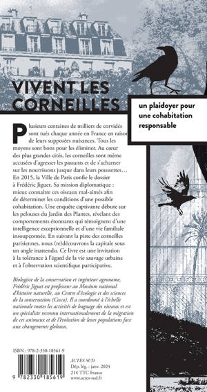 Plusieurs centaines de milliers de corvidés sont tués chaque année en France en raison de leurs supposées nuisances. Tous les moyens sont bons pour les éliminer. Au coeur des plus grandes cités, les corneilles sont même accusées d'agresser les passants et de s'acharner sur les nourrissons jusque dans leurs poussettes... En 2015, la Ville de Paris confie le dossier à Frédéric Jiguet. Sa mission diplomatique : mieux connaître ces oiseaux mal-aimés afin de déterminer les conditions d'une possible cohabitation. Une enquête captivante débute sur les pelouses du Jardin des Plantes, révélant des comportements étonnants qui témoignent d'une intelligence exceptionnelle et d'une vie familiale insoupçonnée. En suivant la piste des corneilles parisiennes, nous (re) découvrons la capitale sous un angle inattendu. Ce livre est une invitation à la tolérance à l'égard de la vie sauvage urbaine et à l'observation scientifique participative.