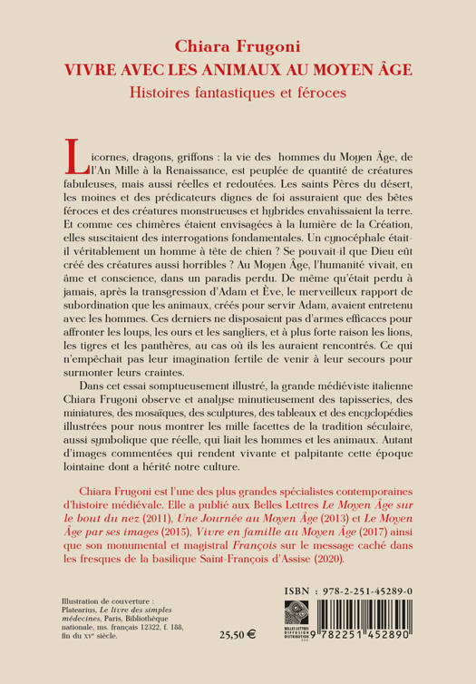 Licornes, dragons, griffons: la vie des hommes du Moyen Age, de l'An Mille a la Renaissance, est peuplee de quantite de creatures fabuleuses, mais aussi reelles et redoutees. Les saints Peres du desert, les moines et des predicateurs dignes de foi assuraient que des betes feroces et des creatures monstrueuses et hybrides envahissaient la terre. Et comme ces chimeres etaient envisagees a la lumiere de la Creation, elles suscitaient des interrogations fondamentales. Un cynocephale etait-il veritablement un homme a tete de chien ? Se pouvait-il que Dieu eut cree des creatures aussi horribles ? Au Moyen Age, l'humanite vivait, en ame et conscience, dans un paradis perdu. De meme qu'etait perdu a jamais, apres la transgression d'Adam et Eve, le merveilleux rapport de subordination que les animaux, crees pour servir Adam, avaient entretenu avec les hommes. Ces derniers ne disposaient pas d'armes efficaces pour affronter les loups, les ours et les sangliers, et a plus forte raison les lions, les tigres et les pantheres, au cas ou ils les auraient rencontres. Ce qui n'empechait pas leur imagination fertile de venir a leur secours pour surmonter leurs craintes. Dans cet essai somptueusement illustre, la grande medieviste italienne Chiara Frugoni observe et analyse minutieusement des tapisseries, des miniatures, des mosaiques, des sculptures, des tableaux et des encyclopedies illustrees pour nous montrer les mille facettes de la tradition seculaire, aussi symbolique que reelle, qui liait les hommes et les animaux. Autant d'images commentees qui rendent vivante et palpitante cette epoque lointaine dont a herite notre culture.