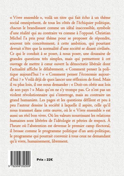 "Vivre ensemble", voilà un titre qui fait écho à un thème social omniprésent, de tous les côtés de l'échiquier politique, chacun le brandissant comme un idéal inaccessible, symbole d'une réalité qui au contraire va comme à l'opposé. Christian Michel l'a pris pour thème pour se proposer de répondre, souvent très concrètement, à cette ambition, qui pourtant devrait n'être que la normalité d'une société se disant civilisée. Ce qui le conduit à se poser, à nous poser une douzaine de grandes questions très simples, mais qui permettent à cet ouvrage de mettre à coeur ouvert la démocratie libérale dont l'actualité affiche le délabrement. "Comment penser la politique aujourd'hui ?" "Comment penser l'économie aujourd'hui ?" Voilà déjà de quoi lancer une réflexion de fond. Mais il va plus loin, il ose nous demander : "Doit-on obéir aux lois de son pays ?" Mais qu'on ne s'y trompe pas. Ce n'est pas un violent révolutionnaire qui s'interroge, mais au contraire un grand humaniste. Les pages et les questions défilent et peu à peu l'auteur dessine la société à laquelle il aspire, celle qu'il nous transmet dans cette oeuvre, où le "Vivre ensemble" est aussi un réel bon vivre. Où les valeurs nourrissant les relations humaines sont libérées de l'idéologie et pétries de respect. A l'heure où l'abstention est devenue le premier camp électoral, il brosse comme le programme politique d'un anti-politique, le programme qui pourrait convenir à tous ceux ne demandant qu'à vivre, librement.