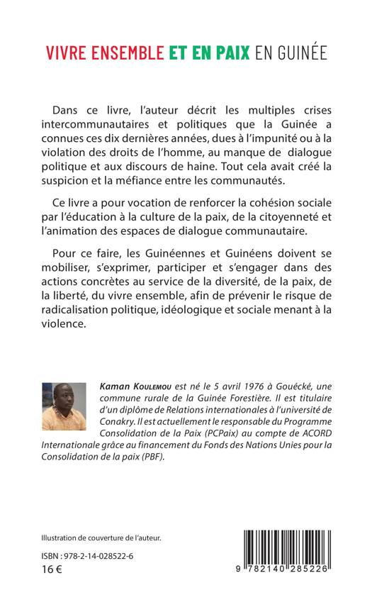Dans ce livre, l'auteur décrit les multiples crises intercommunautaires et politiques que la Guinée a connues ces dix dernières années, dues à l'impunité ou à la violation des droits de l'homme, au manque de dialogue politique et aux discours de haine. Tout cela avait créé la suspicion et la méfiance entre les communautés. Ce livre a pour vocation de renforcer la cohésion sociale par l'éducation à la culture de la paix, de la citoyenneté et l'animation des espaces de dialogue communautaire. Pour ce faire, les Guinéennes et Guinéens doivent se mobiliser, s'exprimer, participer et s'engager dans des actions concrètes au service de la diversité, de la paix, de la liberté, du vivre ensemble, afin de prévenir le risque de radicalisation politique, idéologique et sociale menant à la violence.