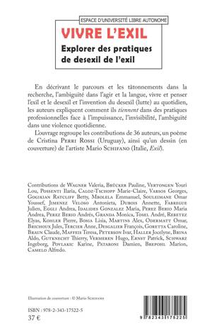 En décrivant le parcours et les tâtonnements dans la recherche, l'ambiguité dans l'agir et la langue, vivre et penser l'exil et le desexil et l'invention du desexil (lutte) au quotidien, les auteurs expliquent comment ils tiennent dans des pratiques professionnelles face à l'impuissance, l'invisibilité, l'ambiguité dans une violence quotidienne. L'ouvrage regroupe les contributions de 36 auteurs, un poème de Cristina Perri Rossi (Uruguay) ainsi qu'un dessin (en couverture) de l'artiste mario Schifano (Italie, Exil).