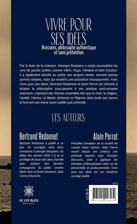 Par le biais de la chanson, Georges Brassens a rendu accessibles les vers de grands poètes comme Villon, Hugo, Verlaine et bien d'autres. Il a également dévoilé au public ses propres textes, souvent perçus comme simples, mais qui recèlent une puissance insoupçonnée. Avec Vivre pour ses idées, Bertrand Redonnet et Alain Perrot ont cherché à éclairer la philosophie sous-jacente à ses quelque cent-soixante chansons, explorant des thèmes essentiels tels que la mort, la religion, l'amitié, l'amour, la liberté, présents en filigrane dans toute son oeuvre et formant une trame aussi subtile que profonde.