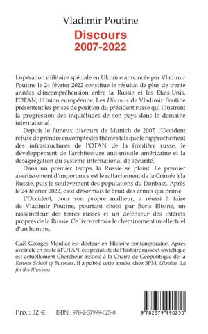L'opération militaire spéciale en Ukraine annoncée par Vladimir Poutine le 24 février 2022 constitue le résultat de plus de trente années d'incompréhension entre la Russie et les États-Unis, l'OTAN, l'Union européenne. Les Discours de Vladimir Poutine présentent les prises de position du président russe qui illustrent la progression des inquiétudes de son pays dans le domaine international. Depuis le fameux discours de Munich de 2007, l'Occident refuse de prendre en compte des thèmes tels que le rapprochement des infrastructures de l'OTAN de la frontière russe, le développement de l'architecture anti-missile américaine et la désagrégation du système international de sécurité. Dans un premier temps, la Russie se plaint. Le premier avertissement d'importance est le rattachement de la Crimée à la Russie, puis le soulèvement des populations du Donbass. Après le 24 février 2022, c'est désormais le bruit des armes qui prime. L'Occident, pour son propre malheur, a réussi à faire de Vladimir Poutine, pourtant choisi par Boris Eltsine, un rassembleur des terres russes et un défenseur des intérêts propres de la Russie. Ce livre retrace le cheminement intellectuel d'un homme.