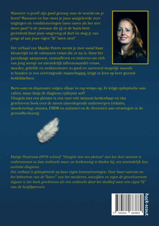 Wanneer is jezelf zijn goed genoeg voor de wereld om je heen? Wanneer en hoe moet je jouw aangeleerde overtuigingen en conditioneringen laten varen als het niet meer past? Is de persoon die jij in de basis bentgecreëerd door jouw omgeving of durf én mag je van jongs af aan jouw eigen “ik” laten zien?Het verhaal van Maaike Peters neemt je mee vanaf haar kleutertijd tot de volwassen vrouw die ze nu is. Door hetjarenlange aanpassen, camoufleren en imiteren om zich van jong meisje tot uiteindelijk (alleenstaande) vrouw,moeder, geliefde en werkneemster zo goed en succesvol mogelijk staande te houden in een overvragende maatschappij, krijgt ze keer op keer gezondheidsklachten. Burn-outs en depressies volgen elkaar in rap tempo op. Ze krijgt epileptische aanvallen, maar klopt de diagnose epilepsie wel?Vleugels met een pleister is een voor vele mensen herkenbaar en vlotgeschreven boek over de meest uiteenlopende onderwerpen (relaties, moederschap, trauma, EMDR en autisme) en de diversiteit aan ervaringen in de gezondheidszorg.
