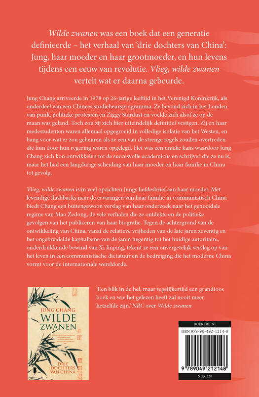 Wilde zwanen was een boek dat een generatie definieerde – het verhaal van ‘drie dochters van China’: Jung, haar moeder en haar grootmoeder, en hun levens tijdens een eeuw van revolutie. Vlieg, wilde zwanen vertelt wat er daarna gebeurde.