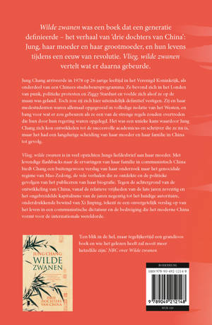 Vlieg, wilde zwanen is niet alleen een politiek boek, maar ook en vooral een persoonlijk verhaal. Het is een ode aan een moeder die haar dochter leerde vliegen, en die haar ondanks alles - stimuleerde vrij te denken. Ontroerend zijn de hoofdstukken waarin haar moeder in 1988 Londen bezoekt. Vlieg, wilde zwanen is een waardige, persoonlijke aanvulling op Wilde zwanen: een boek over vrijheid, over hoe het verleden blijft doorwerken, en over de onverbrekelijke banden met een land dat je gevormd heeft, zelfs als je er niet meer welkom bent.’ Nederlands Dagblad