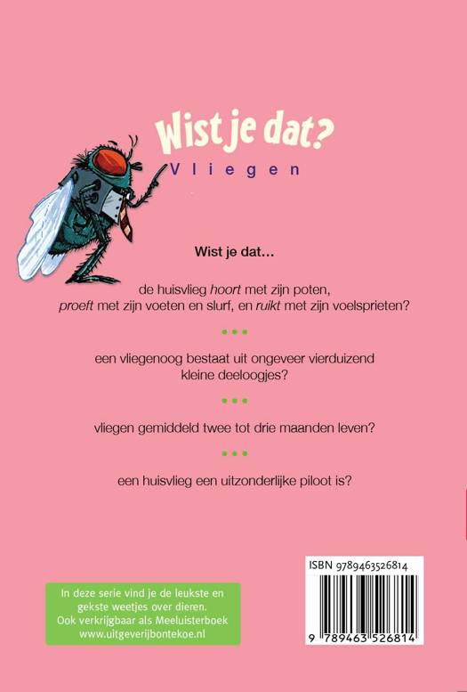 Wist je dat … de huisvlieg hoort met zijn poten, proeft met zijn voeten en slurf, en ruikt met zijn voelsprieten? een vliegenoog bestaat uit ongeveer vierduizend kleine deeloogjes? vliegen gemiddeld twee tot drie maanden leven? een huisvlieg een uitzonderlijke piloot is?