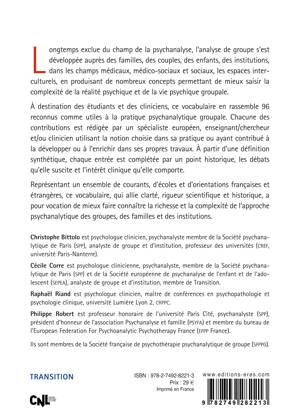 Représentant un ensemble de courants, d'écoles et d'orientations françaises et étrangères, ce vocabulaire, qui allie clarté, rigueur scientifique et historique, a pour vocation de mieux faire connaître la richesse et la complexité de l'approche psychanalytique des groupes, des familles et des institutions.