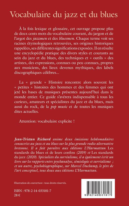 À la fois lexique et glossaire, cet ouvrage propose plus de deux cents mots du vocabulaire courant, du jargon et de l'argot des jazzmen et des bluesmen. Chaque terme voit ses racines étymologiques retrouvées, ses origines historiques rappelées, ses différentes significations exposées. Il en résulte une encyclopédie pratique des divers styles et courants au sein du jazz et du blues, des techniques et outils des artistes, des expressions, connues ou peu connues, propres aux musiciens, des lieux devenus mythiques, des labels discographiques célèbres... La grande Histoire rencontre alors souvent les petites histoires des hommes et des femmes qui ont jeté les bases de musiques présentes aujourd'hui dans le monde entier. Ce guide s'avérera indispensable à tous les curieux, amateurs et spécialistes du jazz et du blues, mais aussi du rock, de la pop music et de toutes les musiques dites actuelles. Attention: vocabulaire explicite !