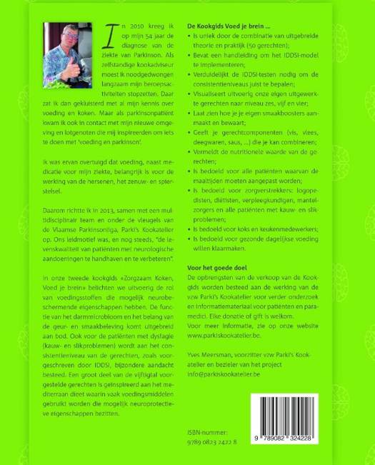 De opbrengsten van de verkoop van de Kookgids worden besteed aan de werking van de vzw Parki’s Kookatelier voor verder onderzoek en informatiemateriaal voor patiënten en paramedici. Elke