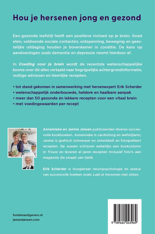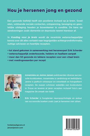 In Voeding voor je brein laten cardioloog Annemieke en receptenmaker-vormgever Janine Jansen samen met professor Erik Scherder zien hoe je met een eenvoudig én lekker eetpatroon je hersenen jong kunt houden. Cognitieve prestaties verbeteren en het risico op hersenaandoeningen zoals dementie en een depressie wordt kleiner. De zussen Jansen vertalen zoals altijd de meest recente wetenschappelijke kennis naar begrijpelijke informatie, concrete acties en heerlijke, fraai in beeld gebrachte recepten.