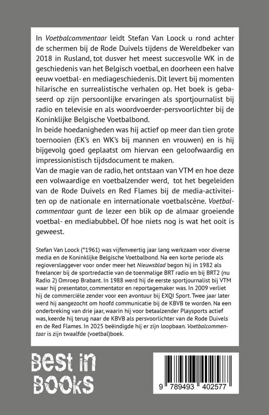 In 'Voetbalcommentaar' leidt Stefan Van Loock u rond achter de schermen bij de Rode Duivels tijdens de Wereldbeker van 2018 in Rusland, tot dusver het meest succesvolle WK in de geschiedenis van het Belgisch voetbal, en doorheen een halve eeuw voetbal- en mediageschiedenis. Dit levert bij momenten hilarische en surrealistische verhalen op. Het boek is gebaseerd op zijn persoonlijke ervaringen als sportjournalist bij radio en televisie en als woordvoerder-persvoorlichter bij de Koninklijke Belgische Voetbalbond. In beide hoedanigheden was hij actief op meer dan tien grote toernooien (EK’s en WK’s bij mannen en vrouwen) en is hij bijgevolg goed geplaatst om hiervan een geloofwaardig en impressionistisch tijdsdocument te maken. Van de magie van de radio, het ontstaan van VTM en hoe deze een volwaardige en voetbalzender werd, tot het begeleiden van de Rode Duivels en Red Flames bij de media-activiteiten op de nationale en internationale voetbalscène. 'Voetbalcommentaar' gunt de lezer een blik op de almaar groeiende voetbal- en mediabubbel. Of hoe niets nog is wat het ooit is geweest.