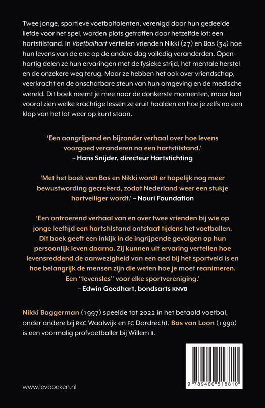 Twee jonge, sportieve voetbaltalenten, verenigd door hun gedeelde liefde voor het spel, worden plots getroffen door hetzelfde lot: een hartstilstand. In Voetbalhart vertellen vrienden Nikki (27) en Bas (34) hoe hun levens van de ene op de andere dag volledig veranderden. Openhartig delen ze hun ervaringen met de fysieke strijd, het mentale herstel en de onzekere weg terug. Maar ze hebben het ook over vriendschap, veerkracht en de onschatbare steun van hun omgeving en de medische wereld. Dit boek neemt je mee naar de donkerste momenten, maar laat ook zien welke krachtige lessen ze eruit haalden en hoe je zelfs na een klap van het lot weer op kunt staan.