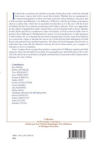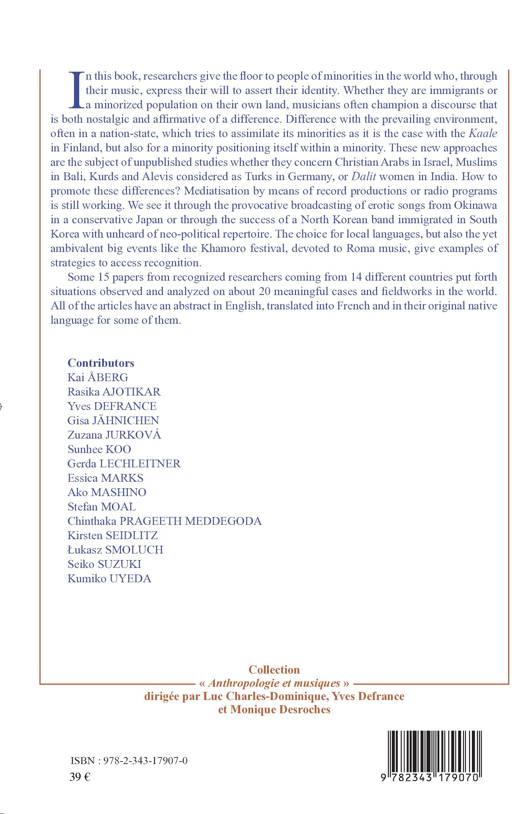 In this book, researchers give the floor to people of minorities in the world who, through their music, express their will to assert their identity. Whether they are immigrants or a minorized population on their own land, musicians often champion a discourse that is both nostalgic and affirmative of a difference. Difference with the prevailing environment, often in a nation-state, which tries to assimilate its minorities as it is the case with the Kaale in Finland, but also for a minority positioning itself within a minority. These new approaches are the subject of unpublished studies whether they concern Christian Arabs in Israel, Muslims in Bali, Kurds and Alevis considered as Turks in Germany, or Dalit women in India. How to promote these differences ? Mediatisation by means of record productions or radio programs is still working. We see it through the provocative broadcasting of erotic songs from Okinawa in a conservative Japan or through the success of a North Korean band immigrated in South Korea with unheard of neo-political repertoire. The choice for local languages, but also the yet ambivalent big events like the Khamoro festival, devoted to Roma music, give examples of strategies to access recognition.