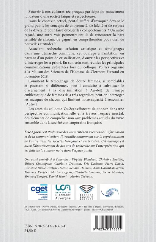 S'ouvrir à nos cultures réciproques participe du mouvement fondateur d'une société laïque et respectueuse. Dans le contexte actuel, peut-il su¬ffire d'invoquer devant le grand public les concepts de citoyenneté, de laïcité et de respect de la diversité pour faire évoluer les comportements ? Un autre regard, une autre voie permettraient-ils de rencontrer la part sensible de chacun, de gagner en compréhension pour oser de nouvelles attitudes ? Associant recherche, création artistique et témoignages dans une démarche commune, cet ouvrage a l'ambition, en partant d'un point de cristallisation, d'ouvrir les perspectives et d'interroger les a priori. En son sein sont réunies les principales communications présentées lors du colloque Voilées organisé à la Maison des Sciences de l'Homme de Clermont-Ferrand en novembre 2018.