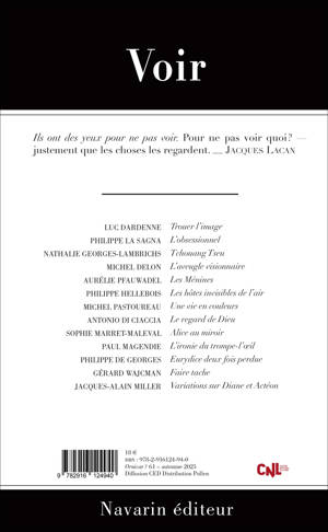 ORNICAR ? 61 VOIR sous dir. Jacques-Alain Miller, Deborah Gutermann-Jacquet"Voir" est partout, tout le temps, si prégnant qu’il en serait presque l’oublié de notre expérience quotidienne. Avec Lacan, pourtant, cette expérience sort de l’évidence. S’appuyant sur les observations de Merleau-Ponty, il disjoint la vision du regard et montre que le regard précède la vision. « "Ils ont des yeux pour ne pas voir". Pour ne pas voir quoi ? – justement que les choses les regardent », comme Lacan le pointe dans son Séminaire XI. Le sujet de la vision se défend contre sa vérité d’objet posé sous le regard : il est une tache, et cette tache a une fonction. Qu’est-ce qu’une tache, un trompe-l’oeil, un voyeur, un tableau ? Qu’est-ce, au fond, que cet objet regard, qui peut, dans la névrose et notamment dans l’obsession, prendre une place si déterminante ? Ce sont à ces questions que les auteurs de ce numéro se confrontent. Jacques-Alain Miller choisit pour en approcher le coeur de se saisir des personnages de Diane et Actéon. Les invités d’"Ornicar ?", le cinéaste Luc Dardenne, l’historien Michel Pastoureau, nous donnent des témoignages cruciaux sur le traitement singulier de cet objet qu’est le regard et de ce voile qu’est la vision. La rubrique consacrée aux références de Lacan poursuit aussi son exploration à travers ses Séminaires pour donner à lire et à voir un peu de la matière dont il alimentait ses réflexions. Cette fois quelques références sont prélevées dans le Séminaire XIV, "La Logique du fantasme". Pour l’occasion, Ornicar ? a invité des mathématiciens. Enfin, un dossier est consacré à « l’avenir des institutions ». Il pose la question de la pratique de la psychanalyse et de l’écoute de la souffrance des sujets dans la cité. Auteurs du Champ freudien : Jacques-Alain Miller, Deborah Gutermann-Jacquet, Catherine Lazarus-Matet, Philippe Hellebois, Yves Depelsenaire, Gérard Wajcman, Pierre Ebtinger, Aurelie Pfauwadel, Marie-Françoise De Munck, Sophie Marret-Maleval, etc. Des auteurs de disciplines affines : (cinéma, peinture, littérature, histoire, philosophie, mathématiques, etc.) : Michel Briand, Luc Dardenne, Michel Delon, Marie-José Durand-Richard, Thomas Hausberger, David Lemler, Paul Magendie, Michel Pastoureau.