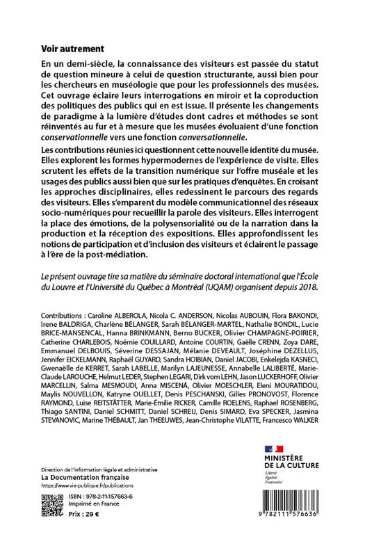 Cet ouvrage est consacré aux changements qui ont marqué récemment l’approche des publics et s’attache à l’exploration d’aspects de la visite jusqu’à présent peu analysés, mal compris ou insuffisamment scrutés. Il passe en revue les résultats de recherches dont les méthodes et les perspectives se sont réinventées à la faveur de la transition numérique mais aussi d’une conception inclusive des publics et d’une offre muséale métamorphosée (notamment pendant la pandémie de COVID 19).