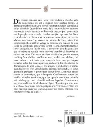 Suffira-t-il avec la poésie d’inventer une langue nouvelle qui dira les hommes égaux ? L’enchaînement des poésies et des petites proses de ce premier volume est un parcours dans la langue du poète, une manière de marcher à ses côtés, à travers les pays du monde. Ce premier volume des Œuvres Poétiques de Joël Vernet contient des textes inédits et une édition révisée des ouvrages suivants parus entre 1985 et 2009 qui inaugurent sa langue de poète au rythme et à la musique singuliers découverts par le grand public dans ses Carnets du lent chemin en 2019 :– J’ai épuisé la ville, Laurent Debut, 1985 ;– Rendu au jour, collection Le Portefaix, Poésie-Rencontres, 1991 ;– À demeurer ainsi au bord d’un soir, accompagné de six gravures originales de Marie Alloy, Éditions du Palimpseste, 1991 ;– Cri de pierre, Jean-Marc Scanreigh, 1997, réédité aux Éditions La Part des Anges, 2003 et La Part commune, 2008 ;– Fatigue éblouissante, avec des dessins de Jean-Gilles Badaire, Les Éditions du frau, 2019 ;– La mort est en feu, La Peur et son éclat et L’enfance est mon pays natal, avec des peintures de Jean-Gilles Badaire, Cadex, 1995 ; – Quand la mer roule vers le soleil, accompagné de six photographies de Julie Ganzin et d’une partition de Xu Yi, Éditions de l’eau, 1998 ;– Gao sans retour, Librairie française de Venise, 2004 ;– À qui appartient le soleil ?, accompagné de dessins et de gravures d’Anne Petrequin, Les Petits classiques du Grand pirate, 2005 ;– Voir est vivre, avec un frontispice de Jean-Gilles Badaire, collection Carnet des sept collines, Jean-Pierre Huguet, 2009.
