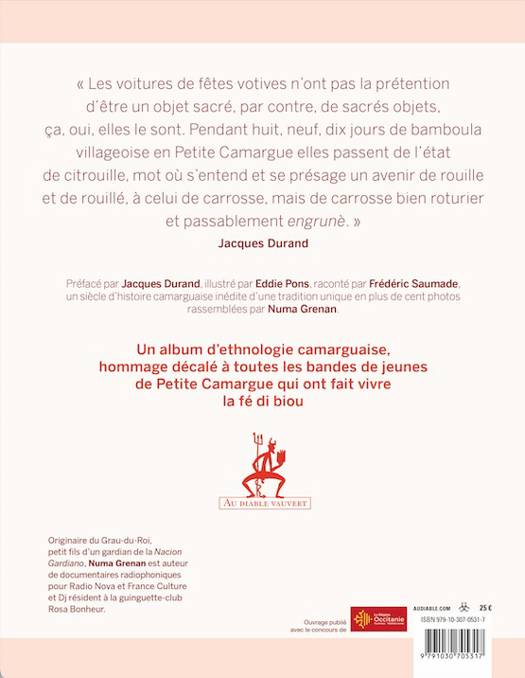 « Les voitures de fêtes votives n'ont pas la prétention d'être un objet sacré, par contre, de sacrés objets, ça, oui, elles le sont. Pendant huit, neuf, dix jours de bamboula villageoise en Petite Camargue elles passent de l'état de citrouille, mot où s'entend et se présage un avenir de rouille et de rouillé, à celui de carrosse, mais de carrosse bien roturier et passablement engrunè. »