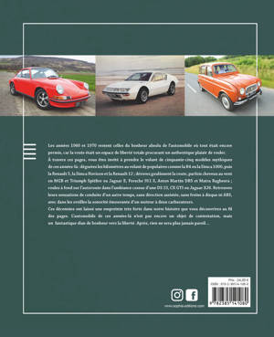 À travers ces pages, vous êtes invité à prendre le volant de cinquante-cinq modèles mythiques de ces années-là : dégustez les kilomètres au volant de populaires comme la R4 ou la Simca 1000, puis la Renault 5, la Simca Horizon et la Renault 12 ; dévorez goulûment la route, parfois cheveux au vent en MGB et Triumph Spitfire ou Jaguar E, Porsche 911 S, Aston Martin DB5 et Matra Bagheera ; roulez à fond sur l’autoroute dans l’ambiance cossue d’une DS 23, CX GTI ou Jaguar XJ6. Retrouvez leurs sensations de conduite d’un autre temps, sans direction assistée, sans freins à disque ni ABS, avec dans les oreilles la sonorité émouvante d’un moteur à deux carburateurs.