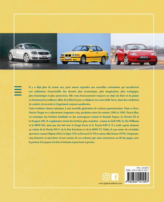 Cette tendance donna naissance à une nouvelle génération de voitures passionnantes. Dans ce livre, Patrice Vergès en a sélectionné cinquante-cinq, produites entre les années 1980 et 1990. Parmi elles, on remarque des berlines familiales et des monospaces comme le Renault Espace, la Citroën ZX et la Peugeot 306. Il a également choisi des berlines plus musclées comme la Golf VR6, la Clio Williams et la BMW M3, ainsi que des 4x4 avec le Range Rover et le Toyota RAV 4. Il a roulé capote abaissée au volant de la Mazda MX-5, de la Fiat Barchetta et de la BMW Z3. Enfin, il a pu tester de véritables sportives comme l’Alpine A610, la Viper GTS, la Ferrari 512 TR et autres Alfa Romeo GTV6. Cinquante-cinq histoires et anecdotes vécues autour de ces voitures que vous retrouverez au fil des pages, avec le parfum d’un passé à la fois si lointain et pourtant si proche.