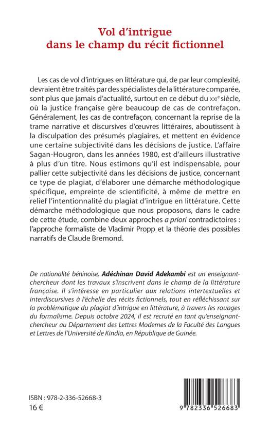 Les cas de vol d'intrigues en littérature qui, de par leur complexité, devraient être traités par des spécialistes de la littérature comparée, sont plus que jamais d'actualité, surtout en ce début du XXIe siècle, où la justice française gère beaucoup de cas de contrefaçon. Généralement, les cas de contrefaçon, concernant la reprise de la trame narrative et discursives d'oeuvres littéraires, aboutissent à la disculpation des présumés plagiaires, et mettent en évidence une certaine subjectivité dans les décisions de justice. L'affaire Sagan-Hougron, dans les années 1980, est d'ailleurs illustrative à plus d'un titre. Nous estimons qu'il est indispensable, pour pallier cette subjectivité dans les décisions de justice, concernant ce type de plagiat, d'élaborer une démarche méthodologique spécifique, empreinte de scientificité, à même de mettre en relief l'intentionnalité du plagiat d'intrigue en littérature. Cette démarche méthodologique que nous proposons, dans le cadre de cette étude, combine deux approches a priori contradictoires l'approche formaliste de Vladimir Propp et la théorie des possibles narratifs de Claude Bremond.