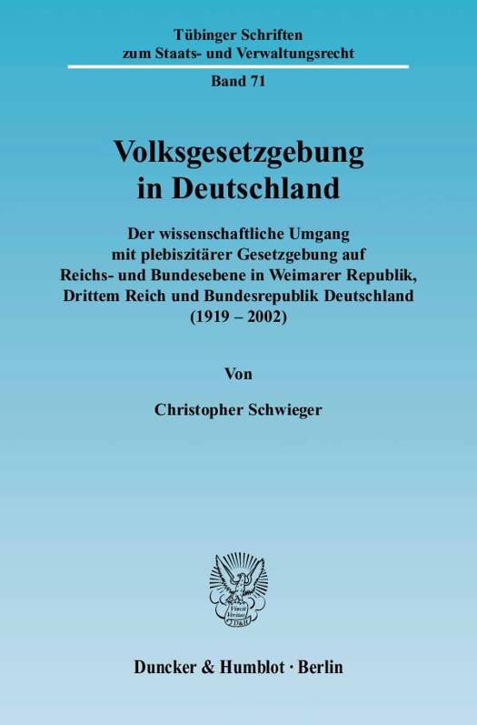 Christopher Schwieger stellt eine erste umfassende Forschungsgeschichte über den wissenschaftlichen Umgang mit einer unmittelbaren Gesetzgebung durch das Volk (Volksgesetzgebung) auf der Ebene von Bund oder Reich in Deutschland von 1919 bis 2002 dar. Eingebettet in einen historischen Rahmen aus Überblicken über die Entstehung der wichtigsten Rechtsnormen, die durchgeführten Volksentscheide und Volksabstimmungen von 1919 bis 1945 sowie die Diskussionen über eine Volksgesetzgebung im Grundgesetz nach 1945, werden die seit 1919 in der Politik-, Rechts- und Geschichtswissenschaft diskutierten Fragestellungen aufgegriffen und unter Nennung der zentralen wissenschaftlichen Beiträge und Autoren dargestellt.