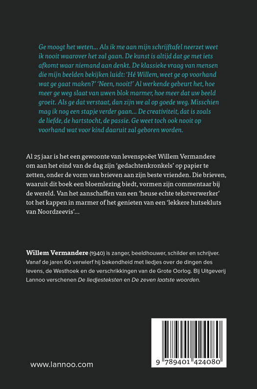 Levenspoëet Willem Vermandere bundelt zijn mooiste brieven Ge moogt het weten... Als ik me aan mijn schrijftafel neerzet weet ik nooit waarover het zal gaan. De kunst is altijd dat ge met iets afkomt waar niemand aan denkt. De klassieke vraag van mensen die mijn beelden bekijken luidt: 'Hé Willem, weet ge op voorhand wat ge gaat maken?' 'Neen, nooit!' Al werkende gebeurt het, hoe meer ge weg slaat van uwen blok marmer, hoe meer dat uw beeld groeit. Als ge dat verstaat, dan zijn we al op goede weg. Misschien mag ik nog een stapje verder gaan... De creativiteit, dat is zoals de liefde, de hartstocht, de passie. Ge weet toch ook nooit op voorhand wat voor kind daaruit zal geboren worden. Al 25 jaar is het een gewoonte van levenspoëet Willem Vermandere om aan het eind van de dag zijn 'gedachtenkronkels' op papier te zetten, onder de vorm van brieven aan zijn beste vrienden. Die brieven, waaruit dit boek een bloemlezing biedt, vormen zijn commentaar bij de wereld. Van het aanschaffen van een ‘heuse echte tekstverwerker' tot het kappen in marmer of het genieten van een 'lekkere hutsekluts van Noordzeevis'...